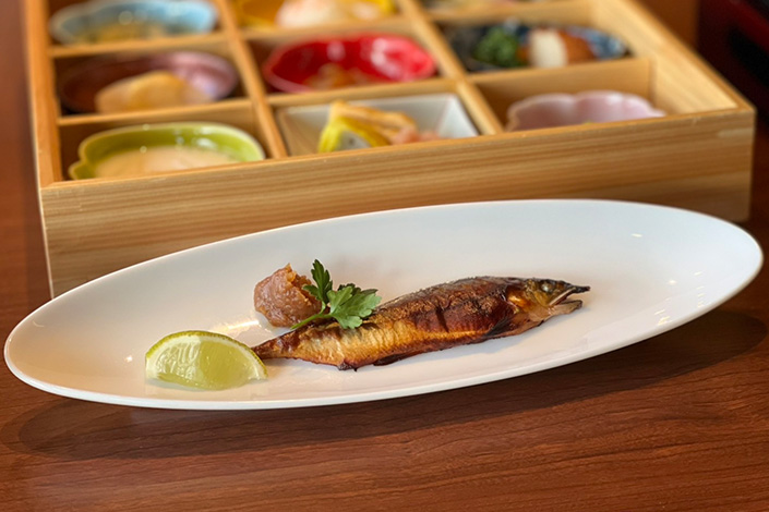 お献立に、鮎の塩焼きは含まれておりません。ご希望の方は、「天然鮎の塩焼き」を別注にて賜りますので、事前にお申し付けくださいませ。