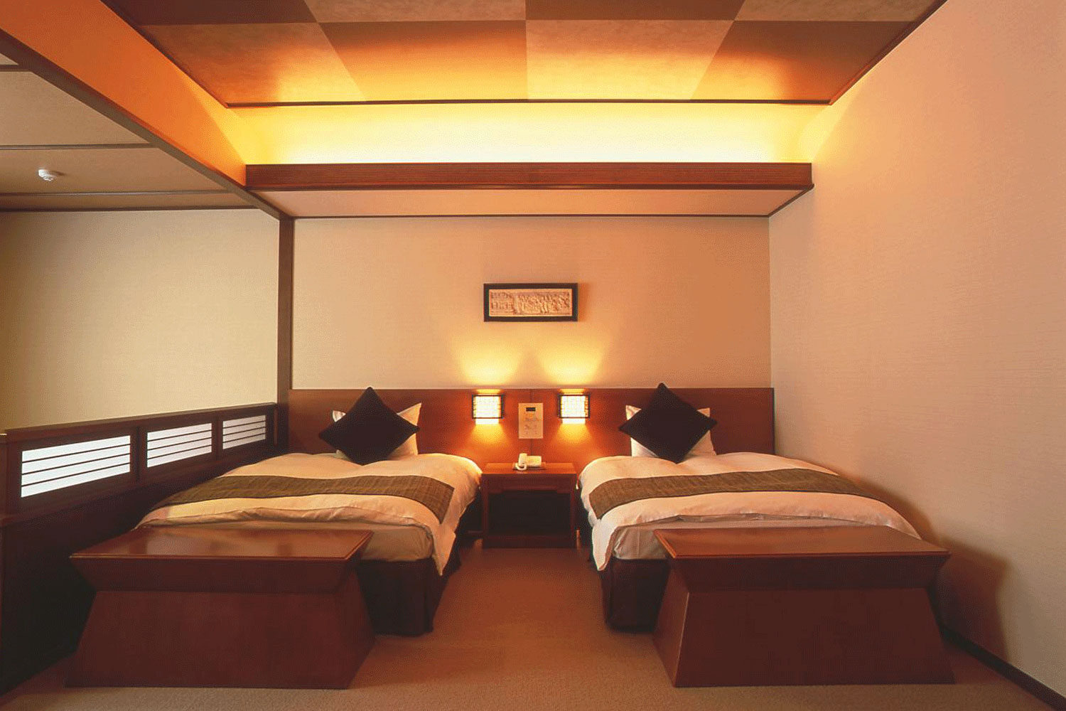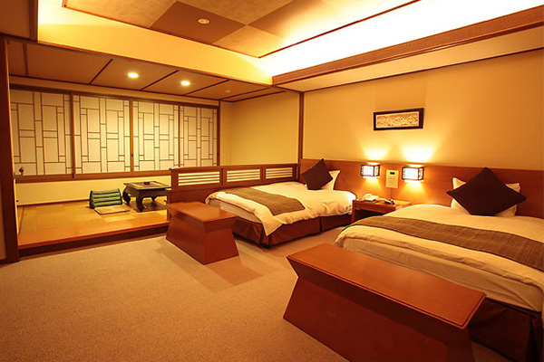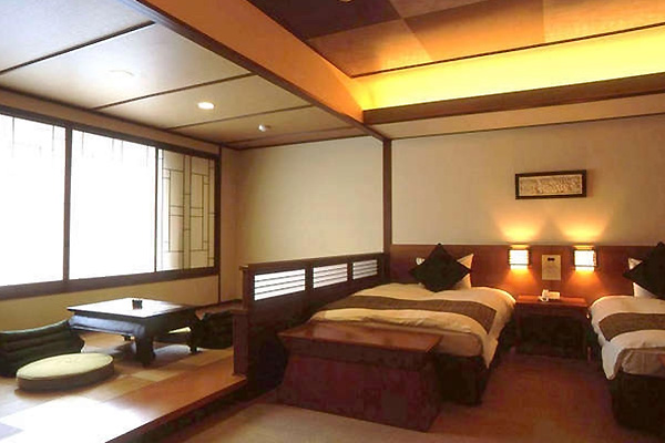 当館で1部屋のみのユニバーサルデザインのデラックスツインルーム。車椅子でのご利用も可能な約55平米のゆったりとしたユニバーサルデザインの洋室。バスルームには手すりも整備。窓側のスペースには車椅子から降りやすい段差のあるリビングスペースがあり、球磨川や南九州山脈の大自然の眺望が楽しめます。4階に位置しており、日本三大急流「球磨川」沿いに面しております。また、3階と5階の露天・大浴場、エレベータにアクセスしやすい場所にございます。