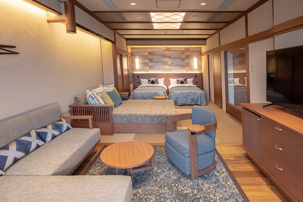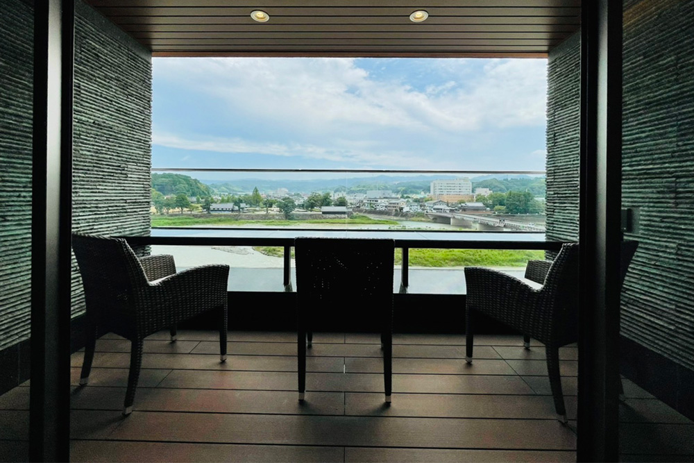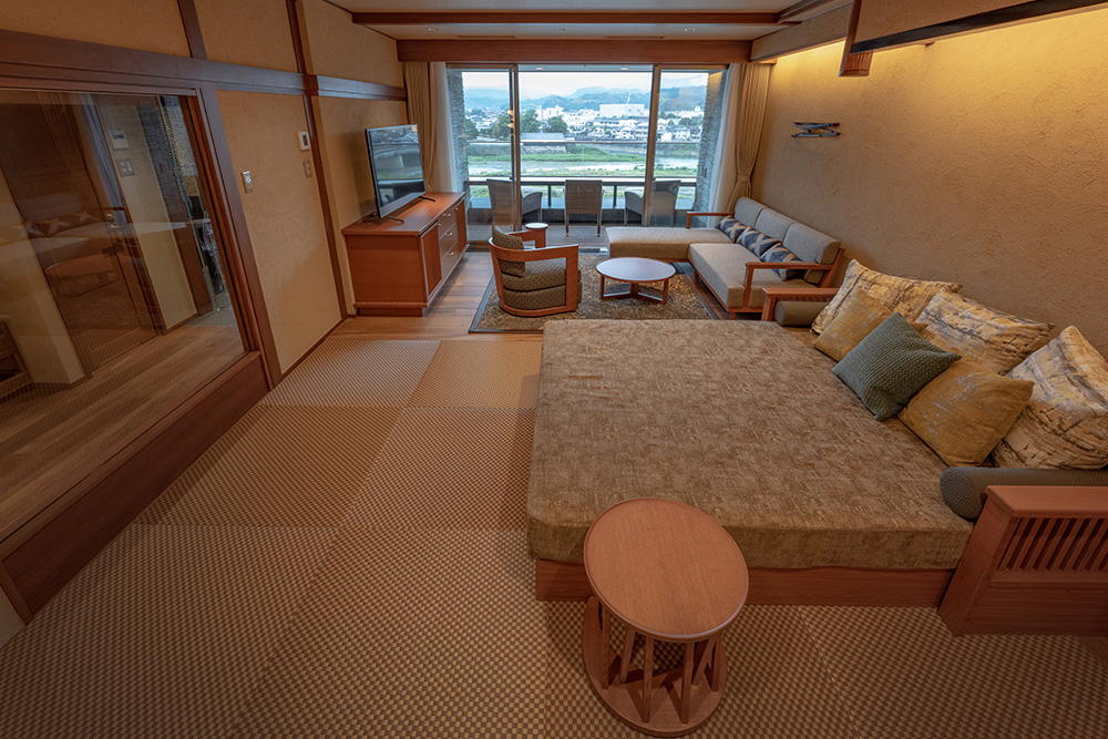 テラスにはカウンターを設けており、球磨川と南九州山脈の大自然を眺めながらドリンクや会話を楽しむも良し、電源もそばにありPCワークも◎。直接源泉を引いた露天風呂では、貴重な温泉資源を大切に使用するため自動昇温システムを備え、適温を保ち、ご滞在中はいつでもプライベートな空間で思う存分温泉をご堪能いただけます。シャワーブースには座高のあるお洒落なバスチェアを用意。アメニティは、女性にうれしいTHALGO JAPANを採用し、標準特典である防水加工の和柄ポーチも人気。