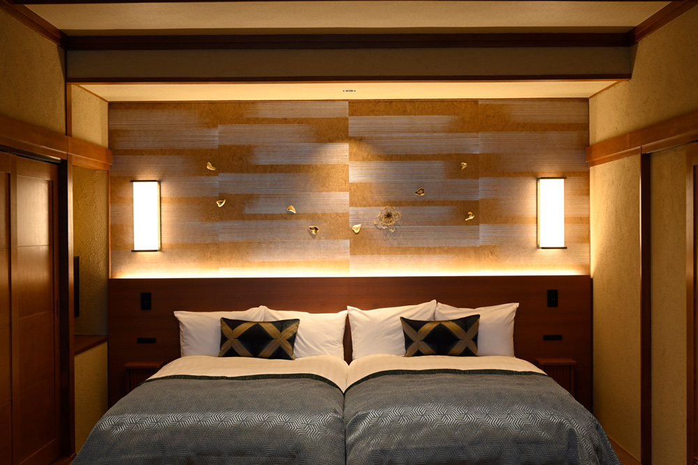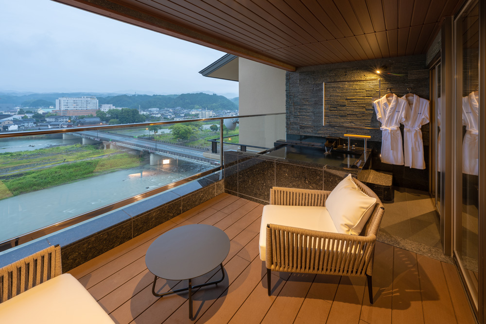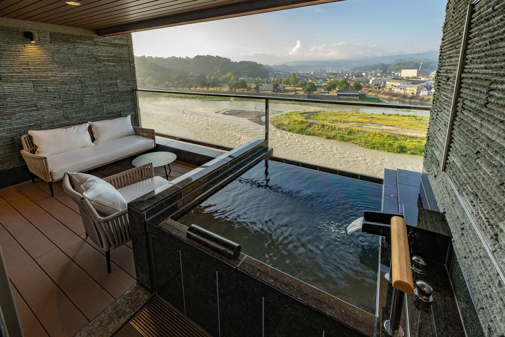 直接源泉を引いた露天風呂では、温泉資源を大切に使用するため自動昇温システムを備え、適温を保ち、ご滞在中はいつでもプライベートな空間で思う存分温泉をご堪能いただけます。シャワーブースには座高のあるお洒落なバスチェアを用意。アメニティは、女性にうれしいTHALGO JAPANを採用し、標準特典である防水加工の和柄ポーチも人気。