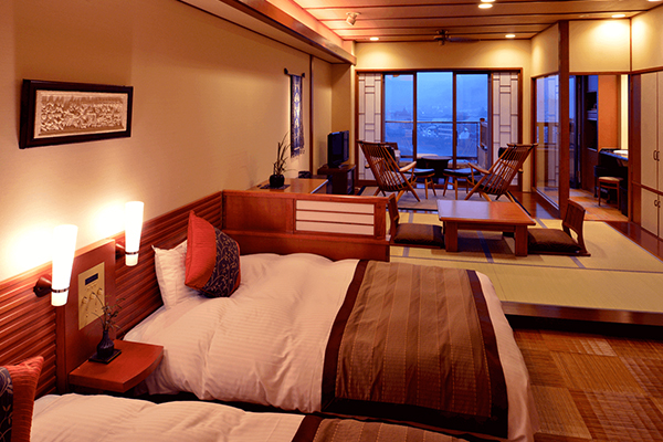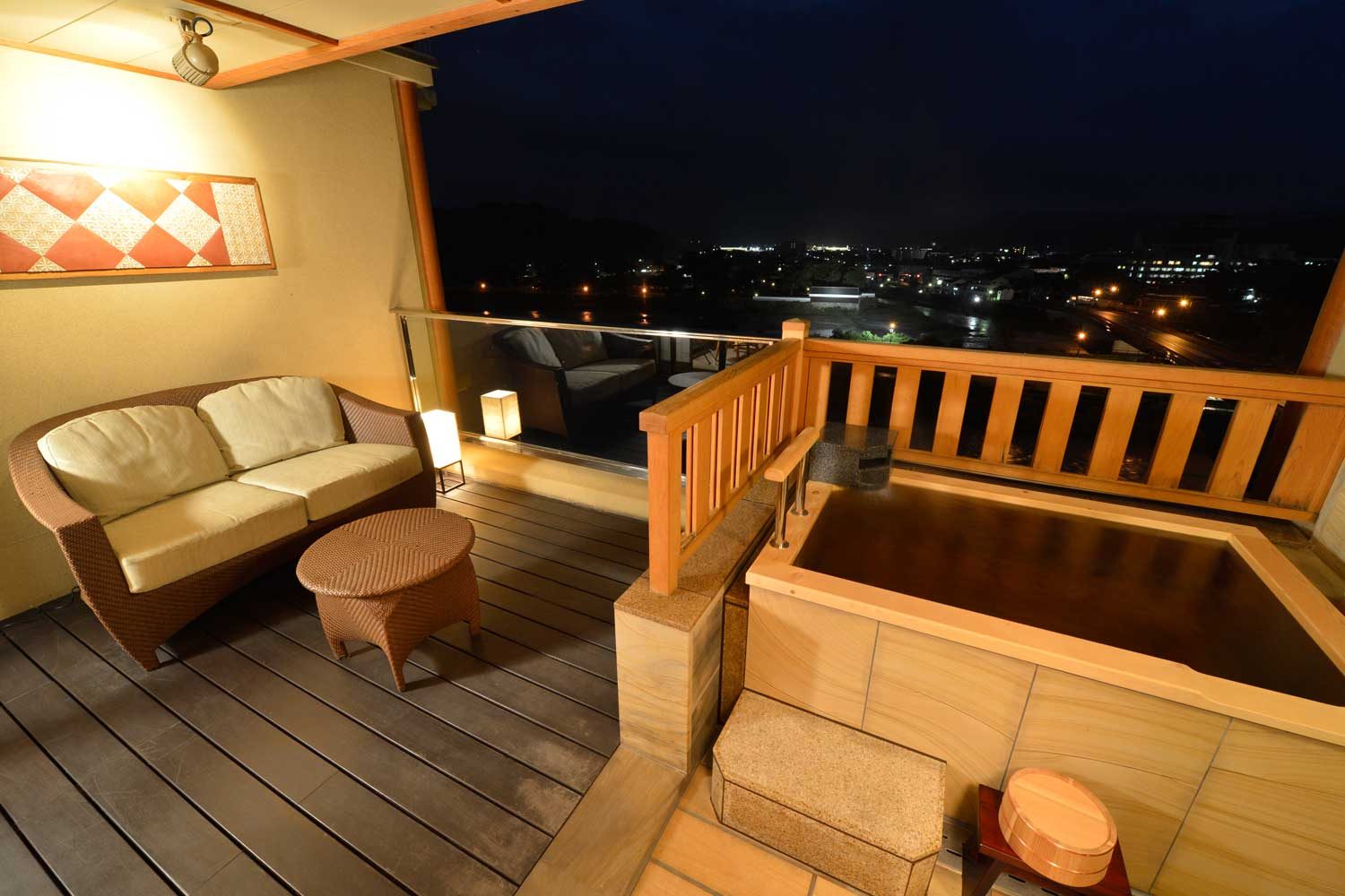 約50平米の温泉露天風呂付きの客室。 テラスにはお寛ぎの空間と源泉を直接引いた露天風呂があり、プライベートで思う存分温泉や球磨川の自然豊かな景色をお楽しみいただけます。 客室はソファ・テーブルのあるリビング付きの和室と和洋室の2タイプ。カップルやお子様連れのファミリーにお薦め。 アメニティは、女性にうれしいTHALGO JAPANを採用し、標準特典である防水加工の和柄ポーチも人気。