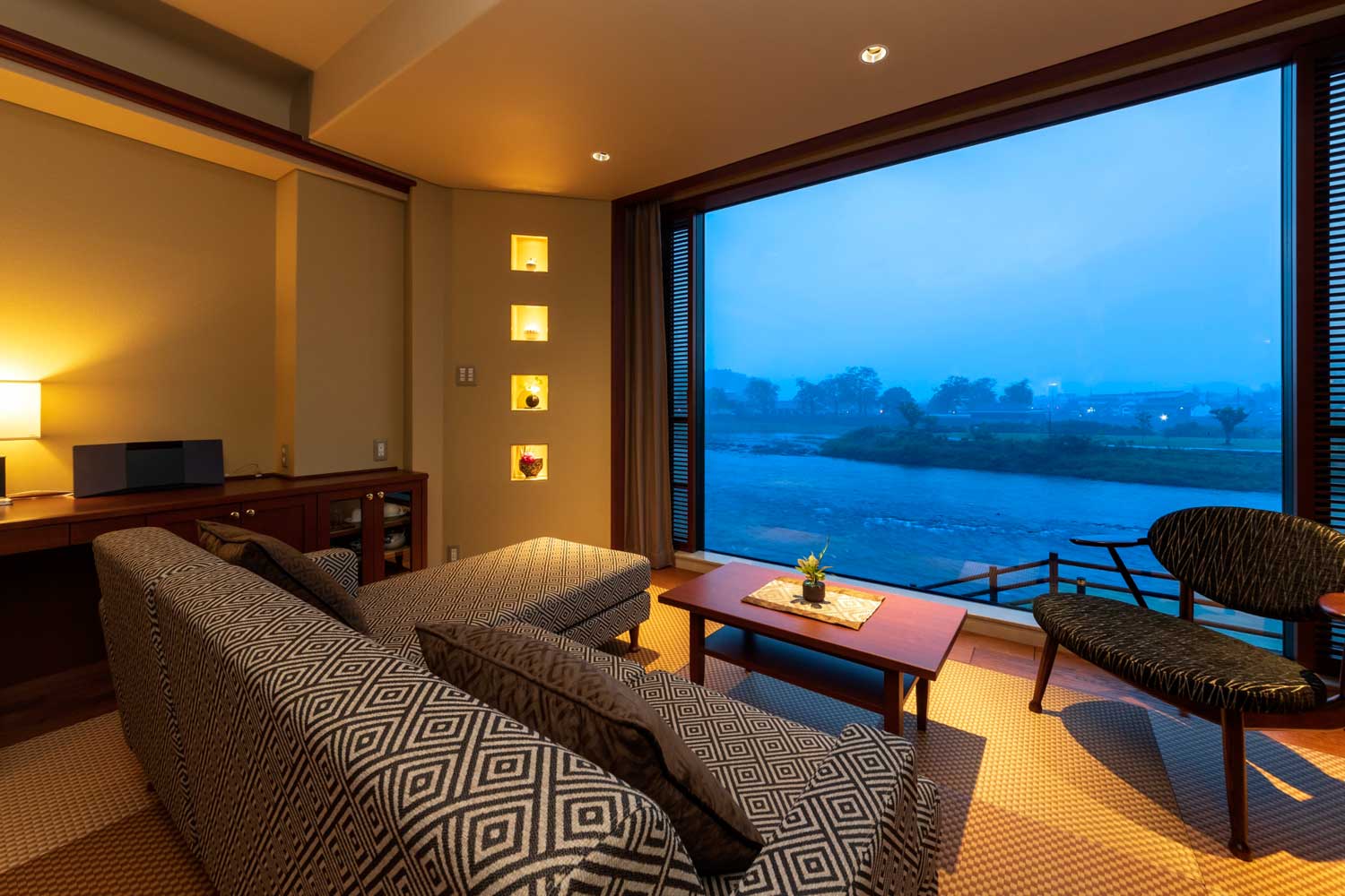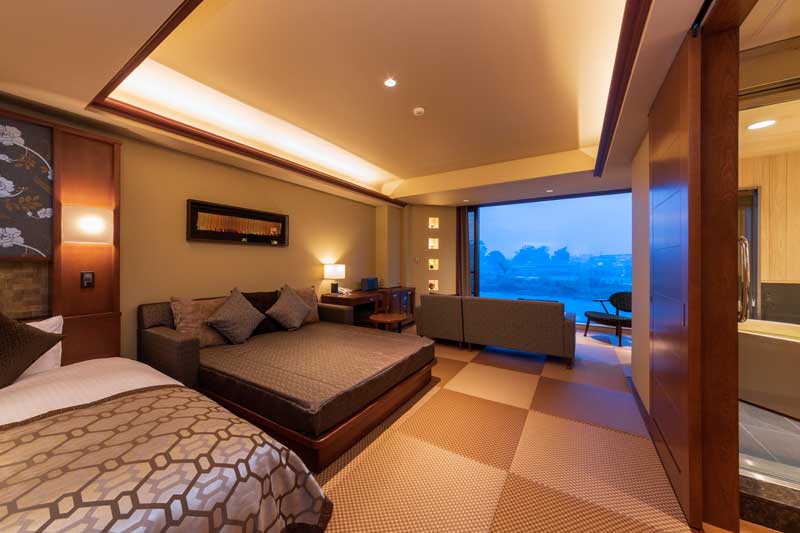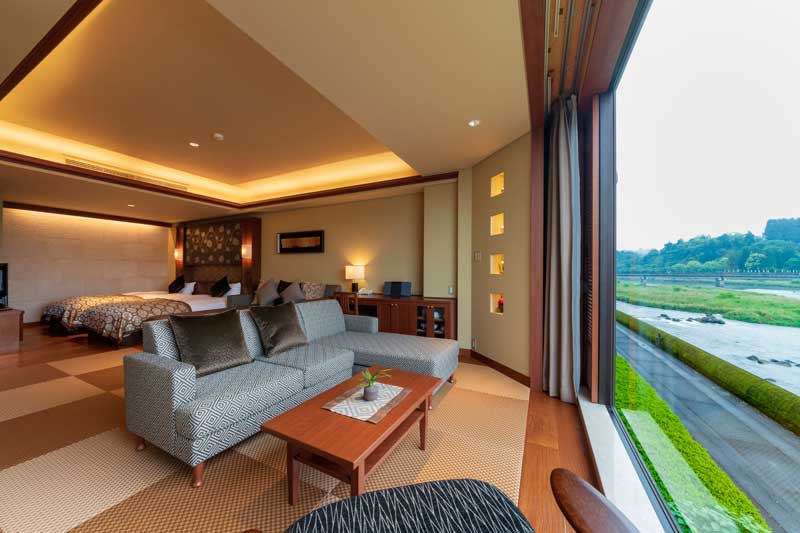 2018年にリニューアルした約55平米の広々とした和洋室。空間にデイベッドと壁一面の球磨川を一望できるピクチャーウィンドウが特徴的。浴室は檜のバスタブを設置し、室内でありながら人吉城址を眺めることができる造り(※温泉ではありません)。アメニティは、女性にうれしいTHALGO JAPANを採用し、標準特典である防水加工の和柄ポーチも人気。カップルや小さなお子様連れのお客様にお薦め
