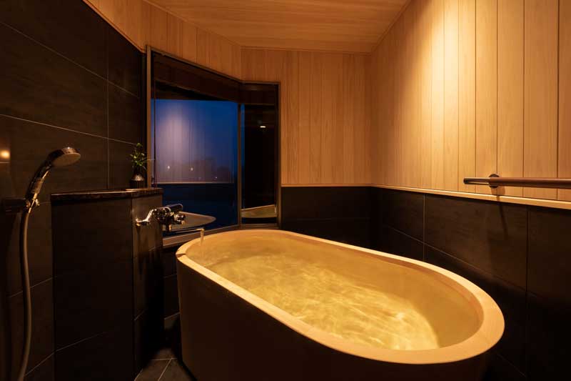 優雅でゆったりとした客室、微かに聞こえる川のせせらぎをBGMに、檜の香り漂う浴槽
